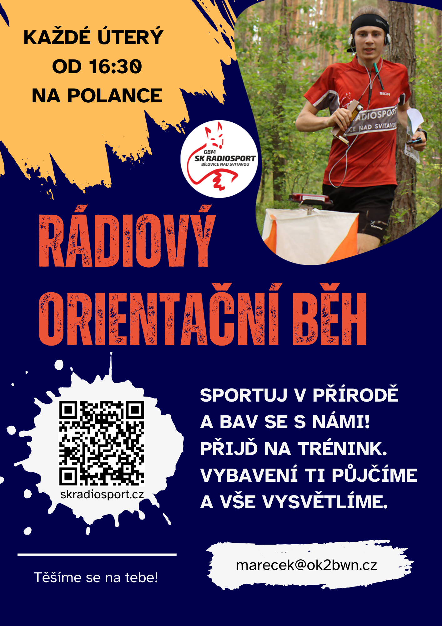 s sebou: vhodné oblečení a obutí na pohyb v lese, láhev s pitím a techniku podle pokynů k tréninku.